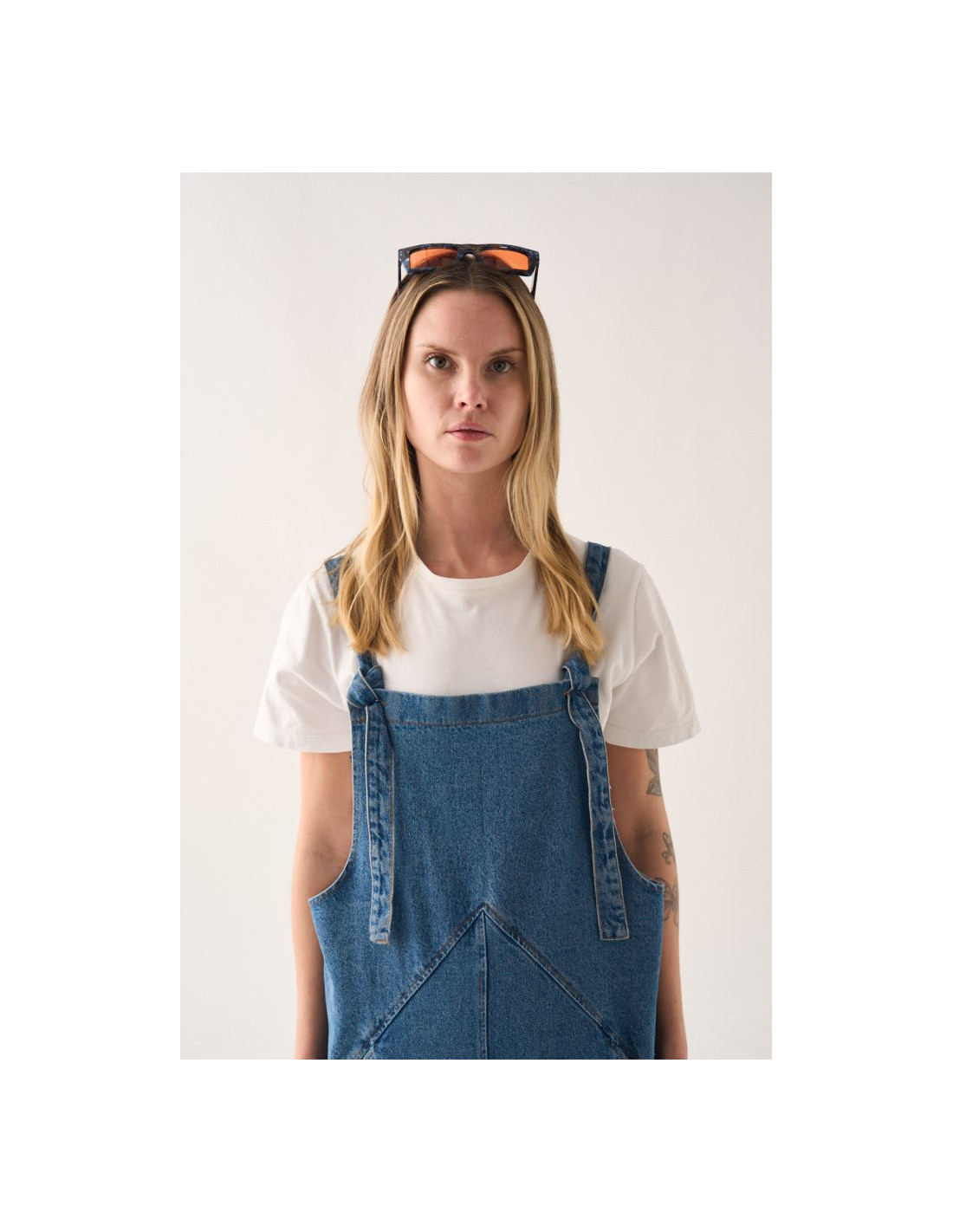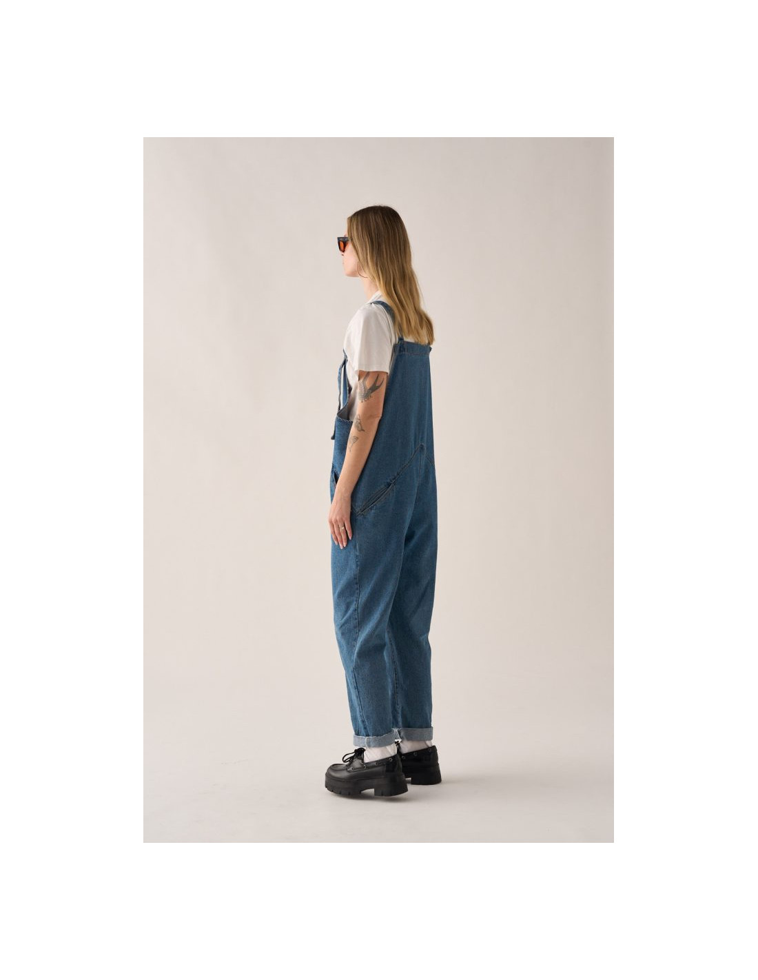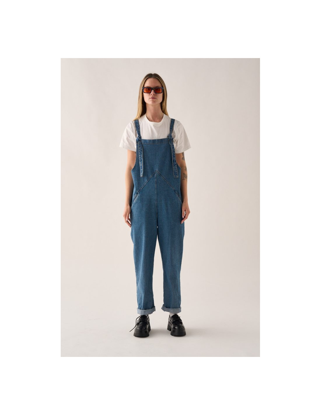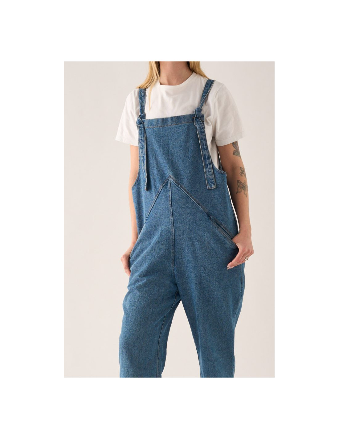 Este peto unisex vaquero no es el típico peto clásico: su diseño minimalista estiliza la figura con un triángulo en la cintura que esconde bolsillos discretos y un corte recto que puedes arremangar a tu estilo.
