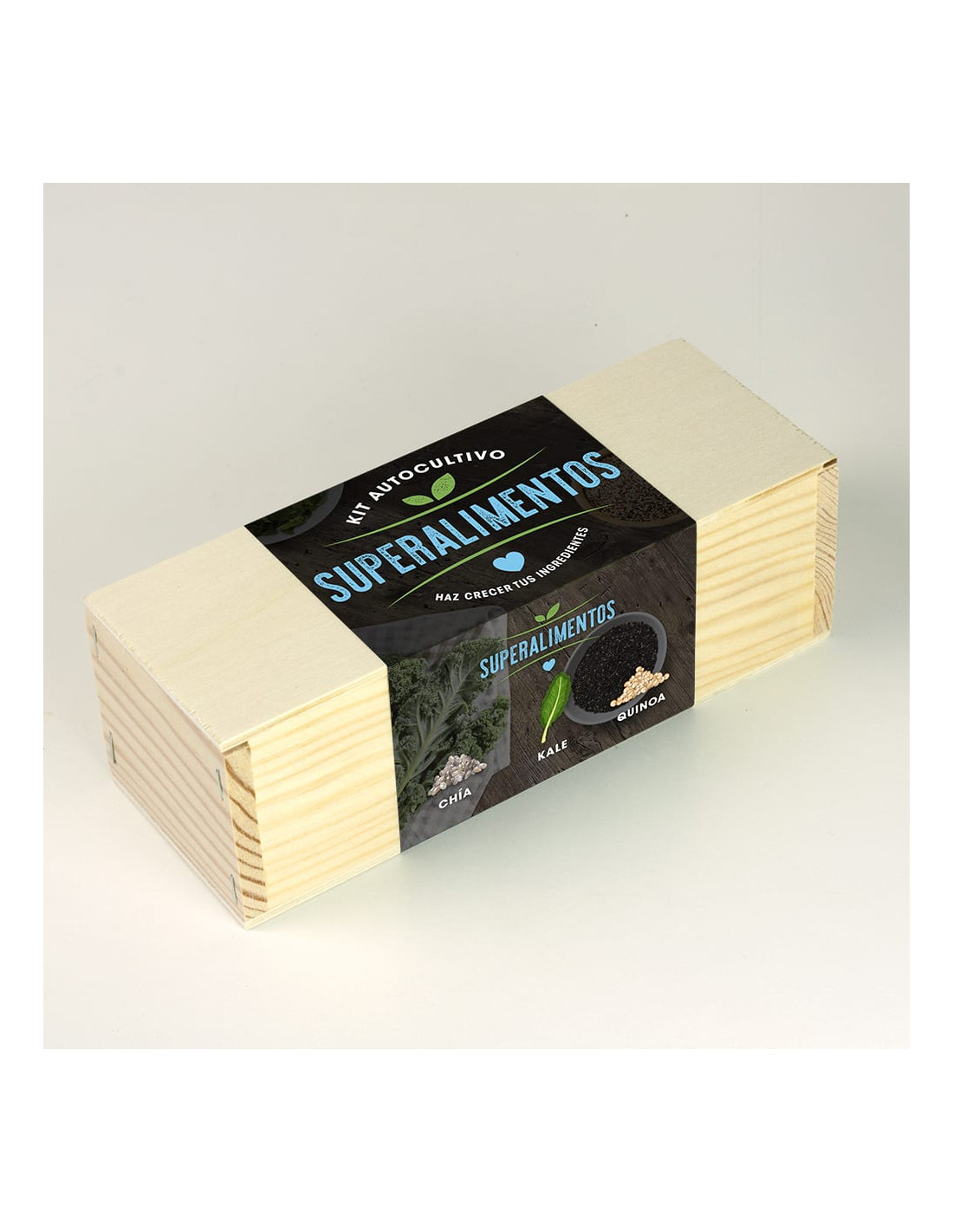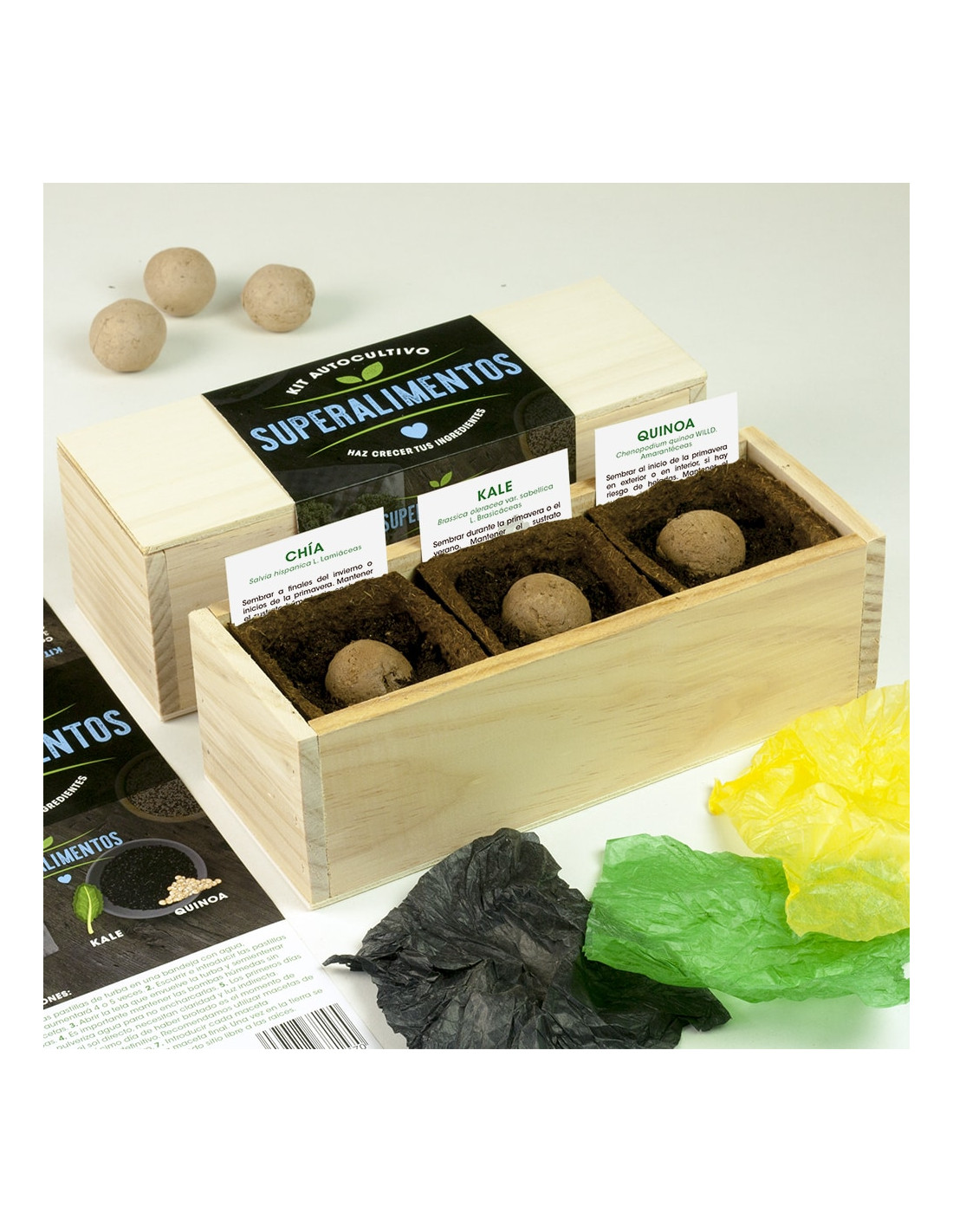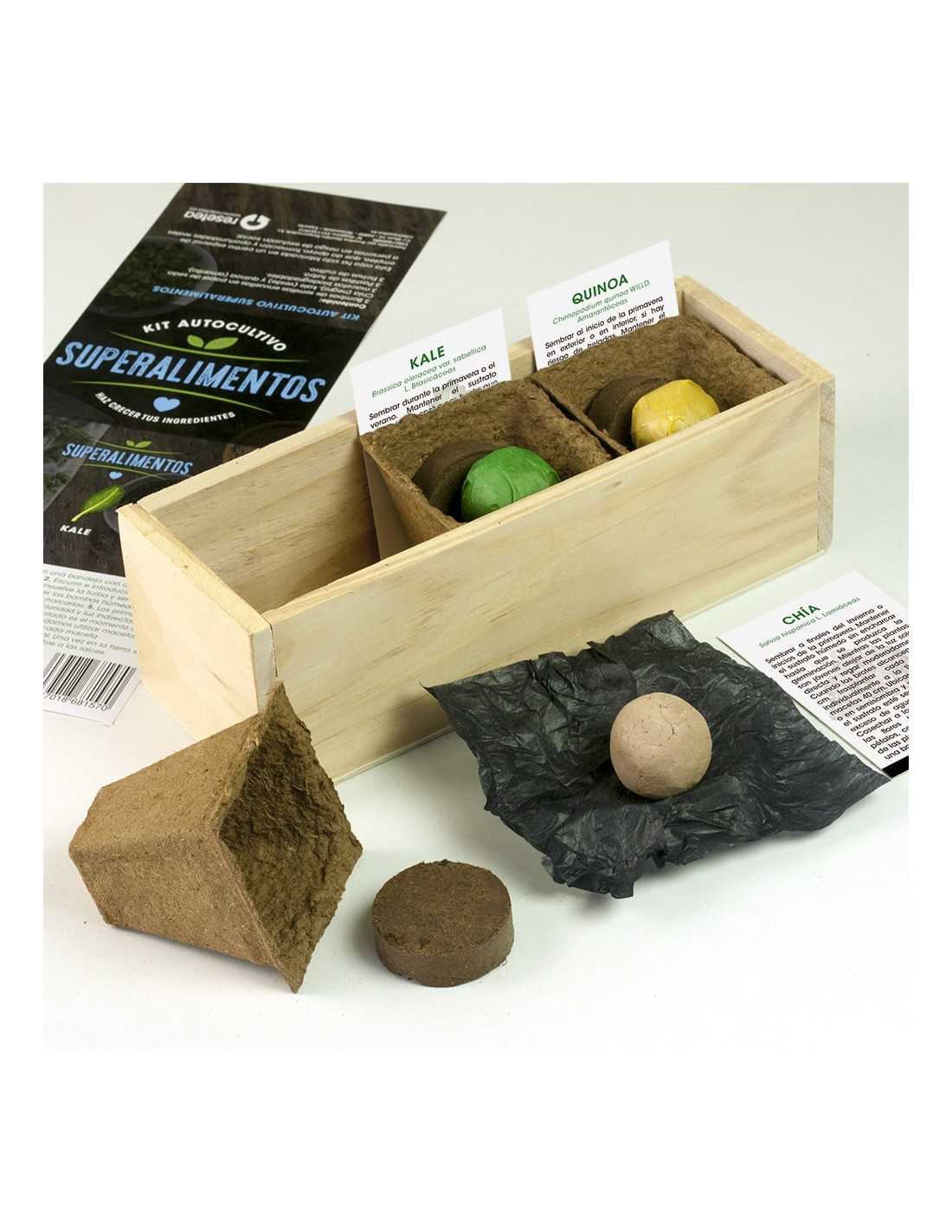 El Kit Superalimentos contiene todo lo necesario para el cultivo de chía, kale y quinoa: 3 macetas de germinación 100% biodegradables, 3 pastillas de turba, 3 bombas de semillas envueltas en papel de seda y 3 fichas con los cuidados necesarios para cada planta.